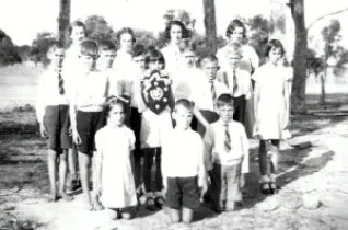 Since ID’d: Front kneeling: (L-R) Nancy Phillips, Leo Tuffley, Charlie Tuffley. Middle:(L-R) Jack Tuffley, Ken Slee? or Vic Ramm??, Bill Heaver?, Ian Phillips, Mollie Ashcroft with the Arthur Watts Shield for Sport, Ian Patterson, Neville Phillips, Bruce Patterson, Kath Ashcroft. Rear: (L-R) Dot Phillips, Shirley Slee? , Heather Phillips, Joyce Slee?